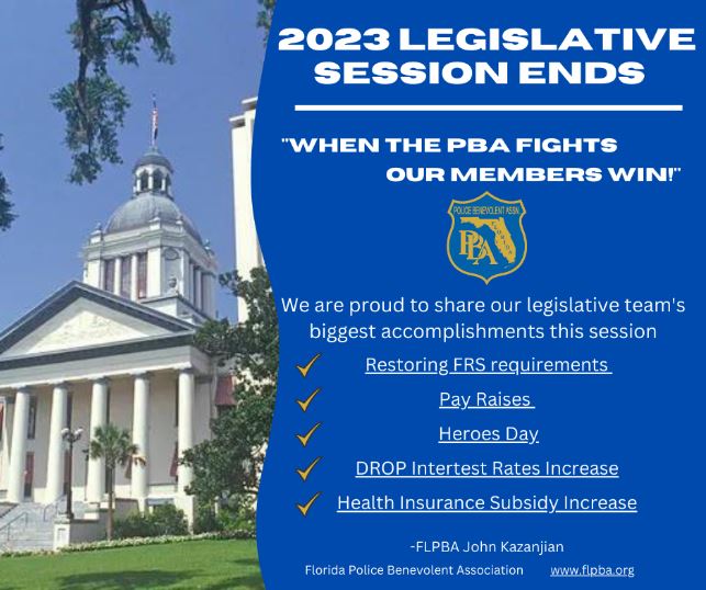 FLORIDA PBA MEMBERS WIN BIG, AS THE 2023 STATE LEGISLATIVE SESSION CONCLUDES WITH NEW FUNDING FOR PAY RAISES FOR STATE EMPLOYEES, RESTORATION OF FRS REQUIREMENTS, DROP INTEREST RATE INCREASES AND AN INCREASE IN THE HEALTH INSURANCE SUBSIDY